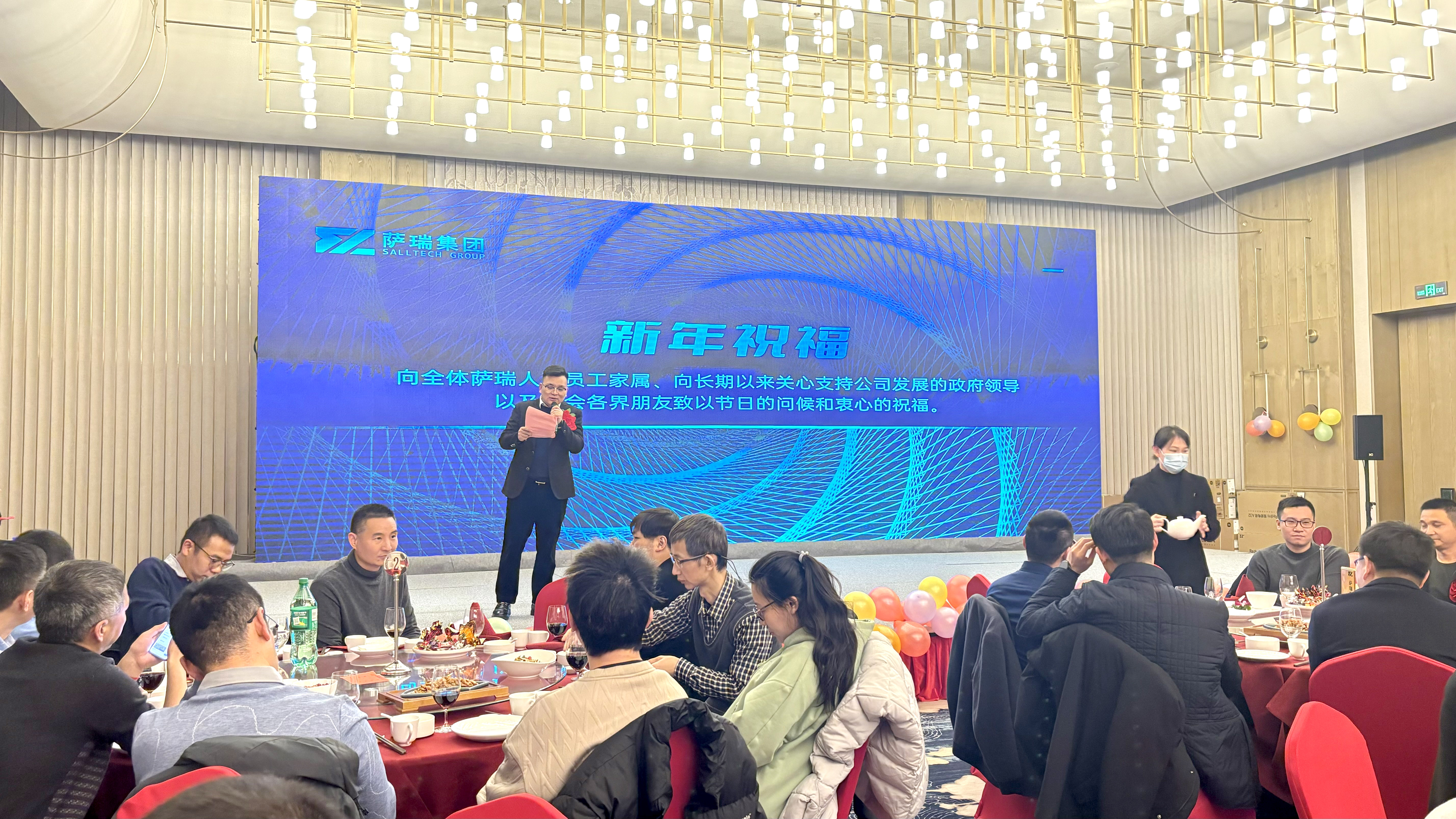 此次晚会由开场介绍、总经理致辞、优秀职工和团队表彰、丰盛晚宴、签订责任状、管理人员祝酒、文艺节目、多轮抽奖等环节组成。